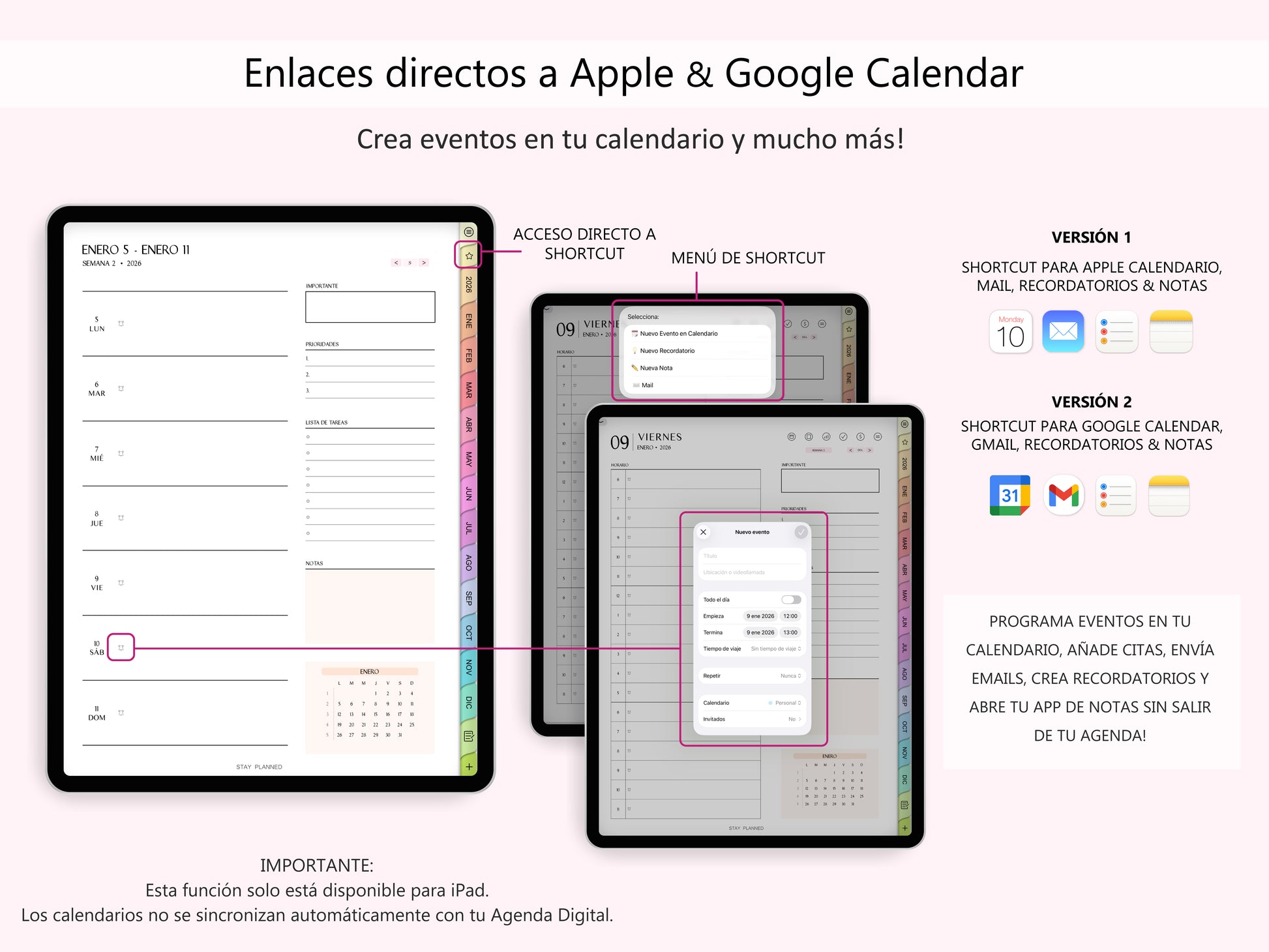 Mejora la organización y productividad con las Agendas Digitales 2025 y 2026. Estas agendas de diseño minimalista combinan la integración de iOS con la compatibilidad con Apple y Google Calendar para una organización rápida y eficaz.